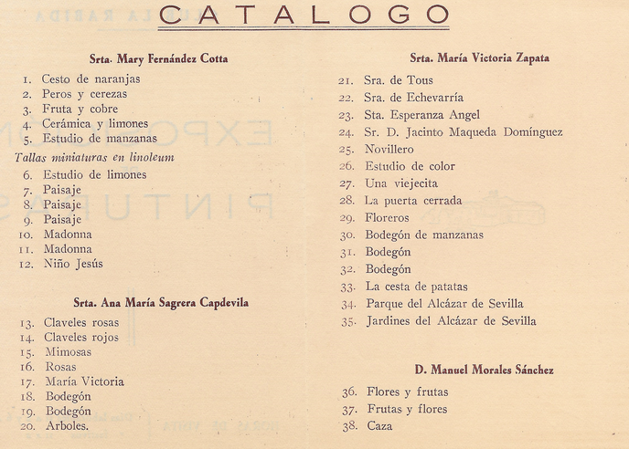Ese mismo año, 1953, expondría además en el club La Rábida, junto a los artistas Mary Fernández-Cotta, María Victoria Zapata y Manuel Morales Sánchez. La afilada pluma del crítico de arte Manuel Olmedo calificaría como de “discreta” la exposición de estos cuatro jóvenes, aunque la mencionaría con estas palabras