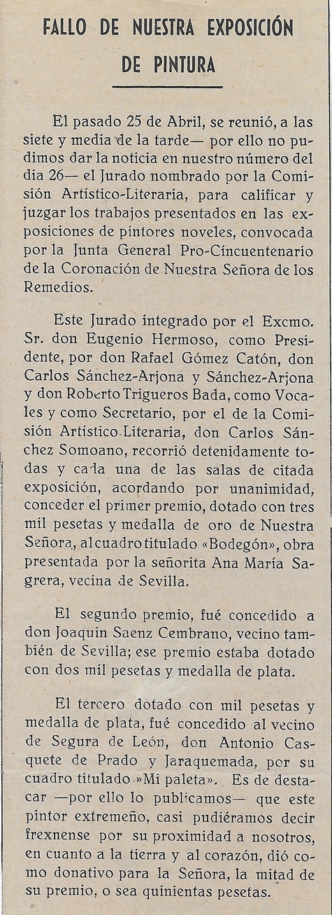 Recibiría un nuevo reconocimiento en abril de 1956 cuando se celebró la Exposición de Pintores Noveles en Fregenal de la Sierra (Badajoz). El jurado, del que formaban parte los pintores Eugenio Hermoso y Rafael Gómez Catón, acordaría por unanimidad otorgarle el primer premio y medalla de oro por su obra “Bodegón”.