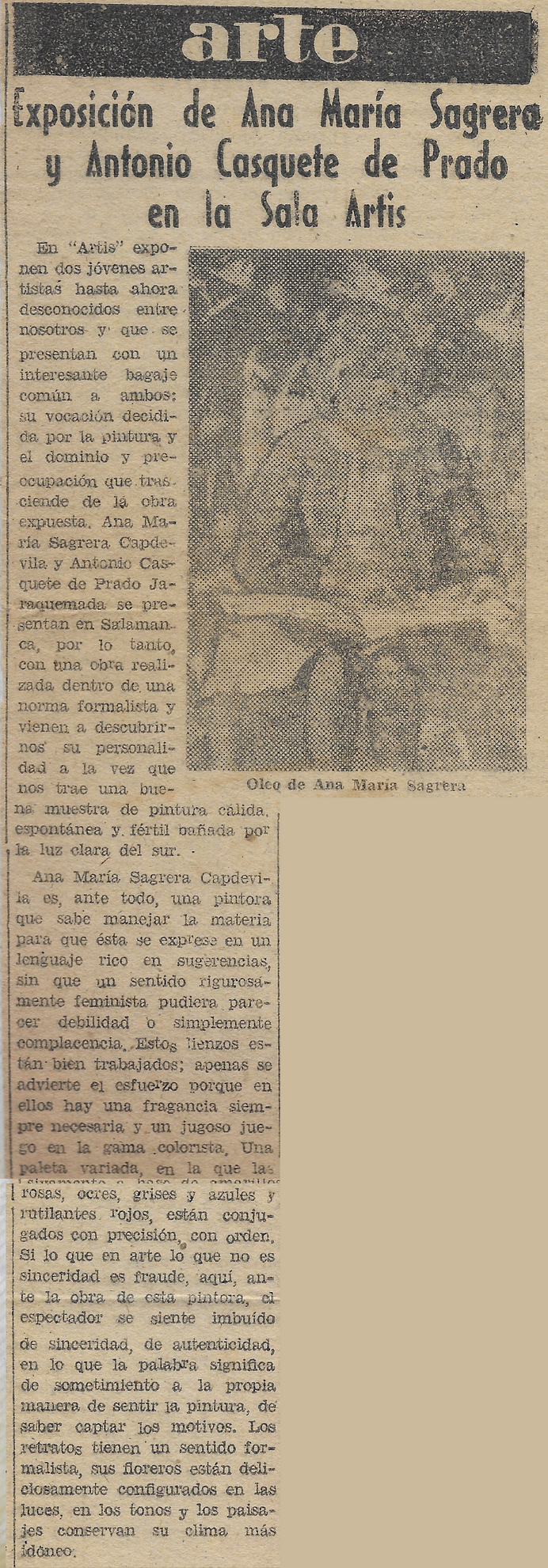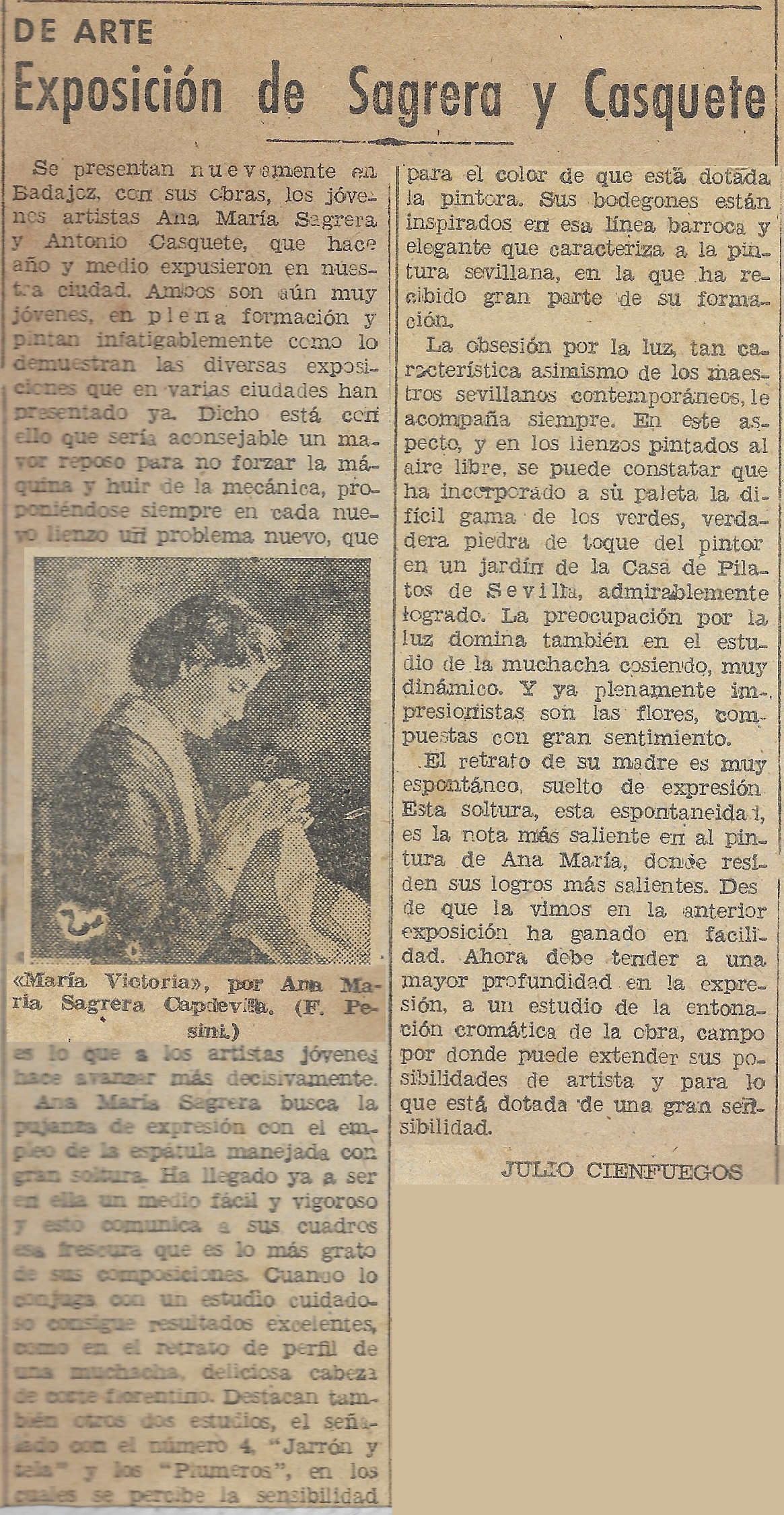 “la pintura de Ana María Sagrera es una pintura vigorosa, de factura decidida, que encuentra su forma de expresión adecuada co la técnica de la espátula, maravillosamente manejada. Ana María no tiene nada que aprender en el arte del bodegón ni en el trabajoso y difícil de las flores” […] “y, sobre todo, en el retrato, de loq ue es buena muestra el exquisito de María Victoria, en el que ha logrado la más fiel expresión de la psicología de la retrada” (HOY de Badajoz, diciembre 1956)