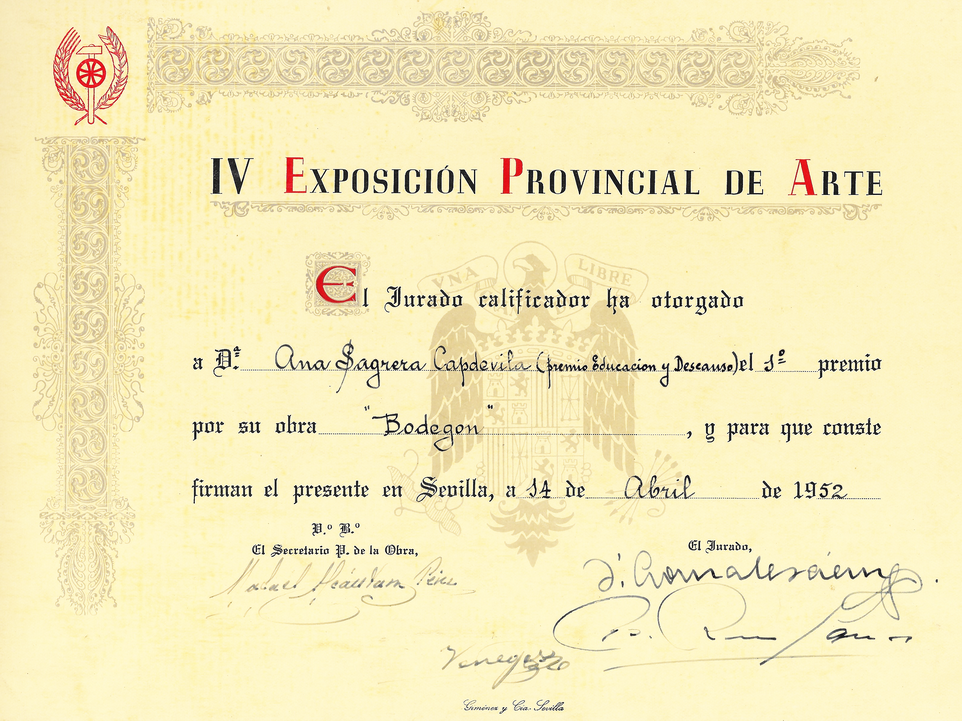La primera aparición de Ana María Sagrera en el panorama pictórico se produjo en 1952, cuando participó en la IV Exposición Provincial de Arte de Sevilla Educación y Descanso, certamen concebido para promocionar a los nuevos valores de la pintura. Su obra “Estudio” recibió el premio “Educación y Descanso”, consistente en una cantidad en metálico y, lo más interesante, le permitió participar en la X Exposición Nacional de Arte Educación y Descanso celebrada en Madrid ese mismo año. Concurriría con la obra premiada y otra titulada «Limones».