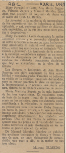 “ Los floreros y bodegones de Ana María Sagrera son claro exponente de una sensibilidad y exquisito gusto. También se polariza su visión en la realidad inmediata del modelo, pero su mayor práctica le abre un márgen a la interpretación y le permite una cierta soltura, dentro de su manera cuidadosa de pintar”. (ABC de Sevilla, abril 1953)»