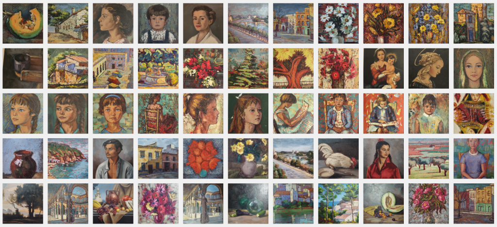 Se muestra a continuación su evolución en la creación de cuadros artísticos, obras realizadas en óleo sobre lienzo o tabla. Pero además durante toda su vida exploró otras formas de expresión, pinturas sobre diversos materiales, trabajos de mosaico y creaciones artísticas diversas.